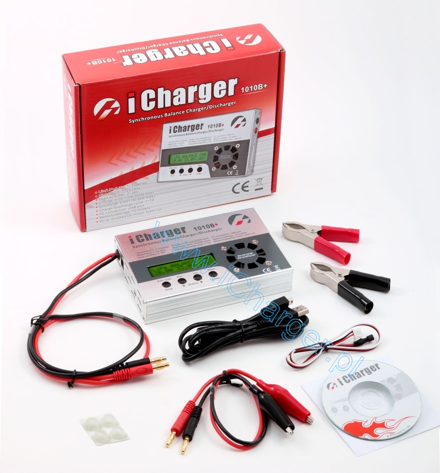 iCharger 1010B+ to zaawansowana ladowarka procesorowa o duzych mozliwosciach. Obsluguje wszystkie stosowane w modelarstwie typy akumulatorów : Ni-Cd, Ni-Mh, Li-Po, Li-Io, Li-Fe, Pb. Posiada wbudowany balancer 2-10s dla Li-xx. Mozliwosc ladowania oraz rozladowywania. Przejrzysty wyswietlacz alfanumeryczny. Stosunkowo niewielkie wymiary sprawiaja ze ladowarka ta jest poreczna i wygodna w użyciu.