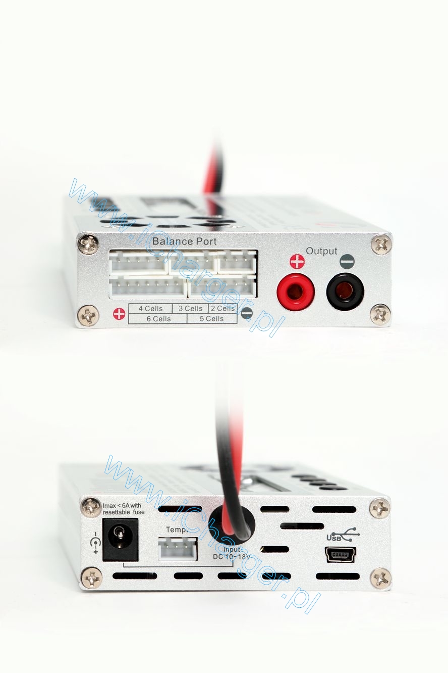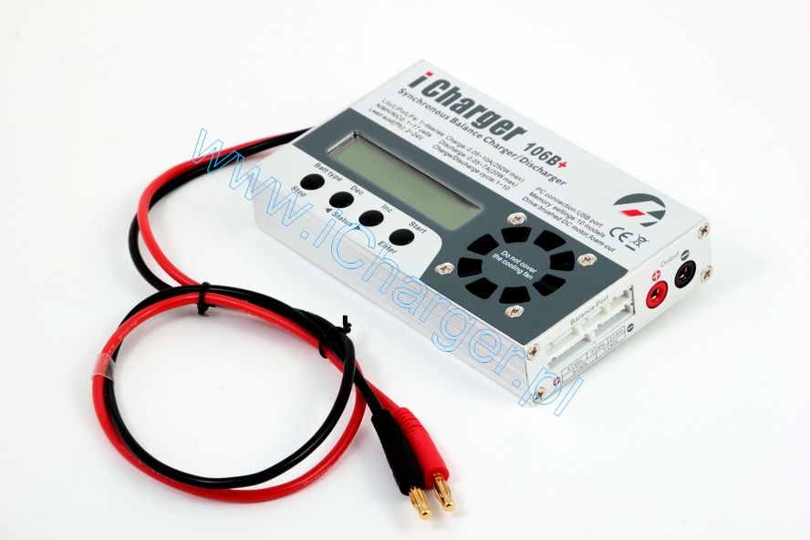 iCharger 106B+ to zaawansowana ladowarka procesorowa o duzych mozliwosciach. Obsluguje wszystkie stosowane w modelarstwie typy akumulatorów : Ni-Cd, Ni-Mh, Li-Po, Li-Io, Li-Fe, Pb. Posiada wbudowany balancer 2-6s dla Li-xx. Mozliwosc ladowania oraz rozladowywania. Przejrzysty wyswietlacz alfanumeryczny. Stosunkowo niewielkie wymiary sprawiaja ze ladowarka ta jest poreczna i wygodna w uzyciu.