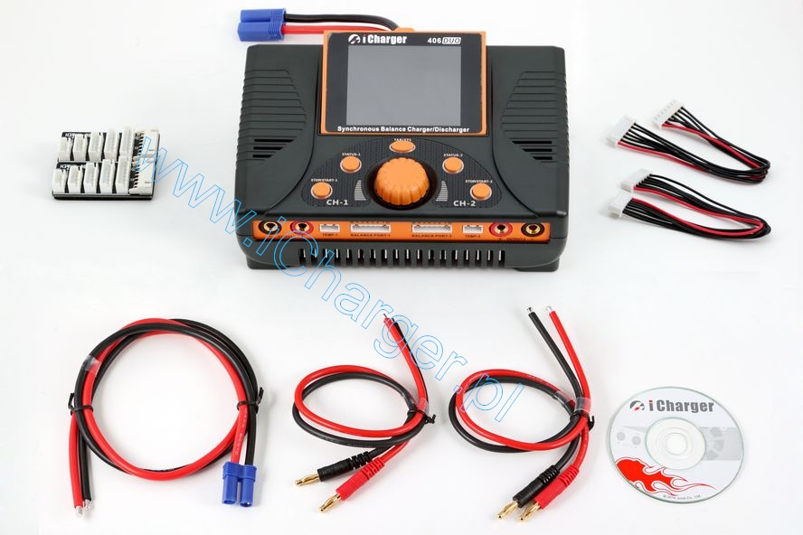iCharger 406 DUO to zaawansowana ladowarka procesorowa o duzych mozliwosciach. Obsluguje wszystkie stosowane w modelarstwie typy akumulatorów : Ni-Cd, Ni-Mh, Li-Po, Li-Io, Li-Fe, Pb. Posiada wbudowany balancer 2-6s dla Li-xx. Mozliwosc ladowania oraz rozladowywania. Przejrzysty wyswietlacz alfanumeryczny. Stosunkowo niewielkie wymiary sprawiaja ze ladowarka ta jest poreczna i wygodna w użyciu. Ładowarka posiada dwa niezalezne kanaly, umowliwiajace ladowanie dwoch apkietow jednoczesnie.